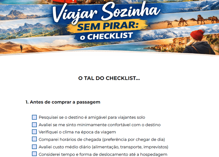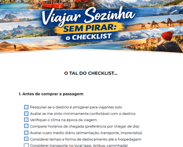 Obtenha um checklist em PDF, simples e objetivo, para te ajudar a planejar sua viagem solo com mais tranquilidade e menos dúvidas.